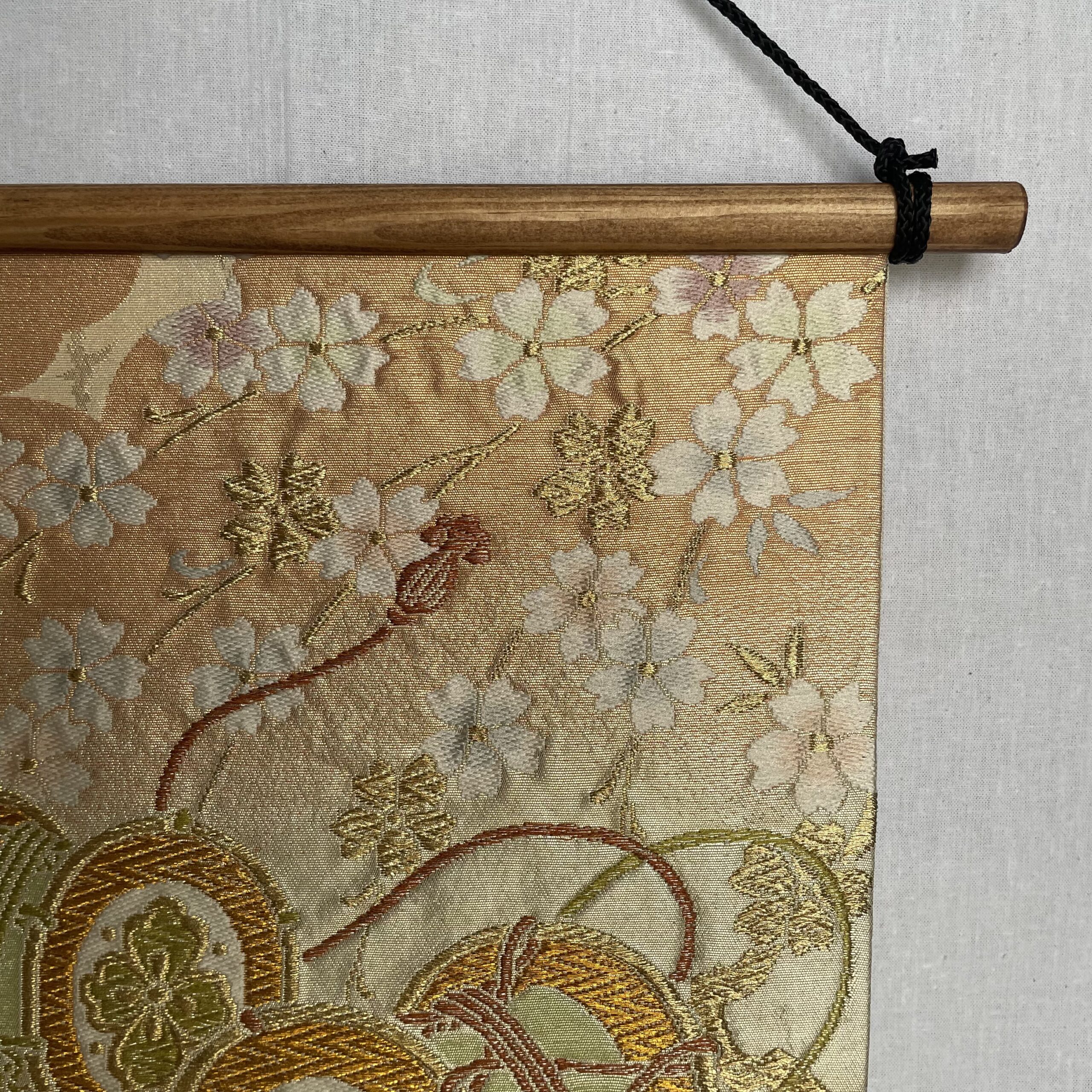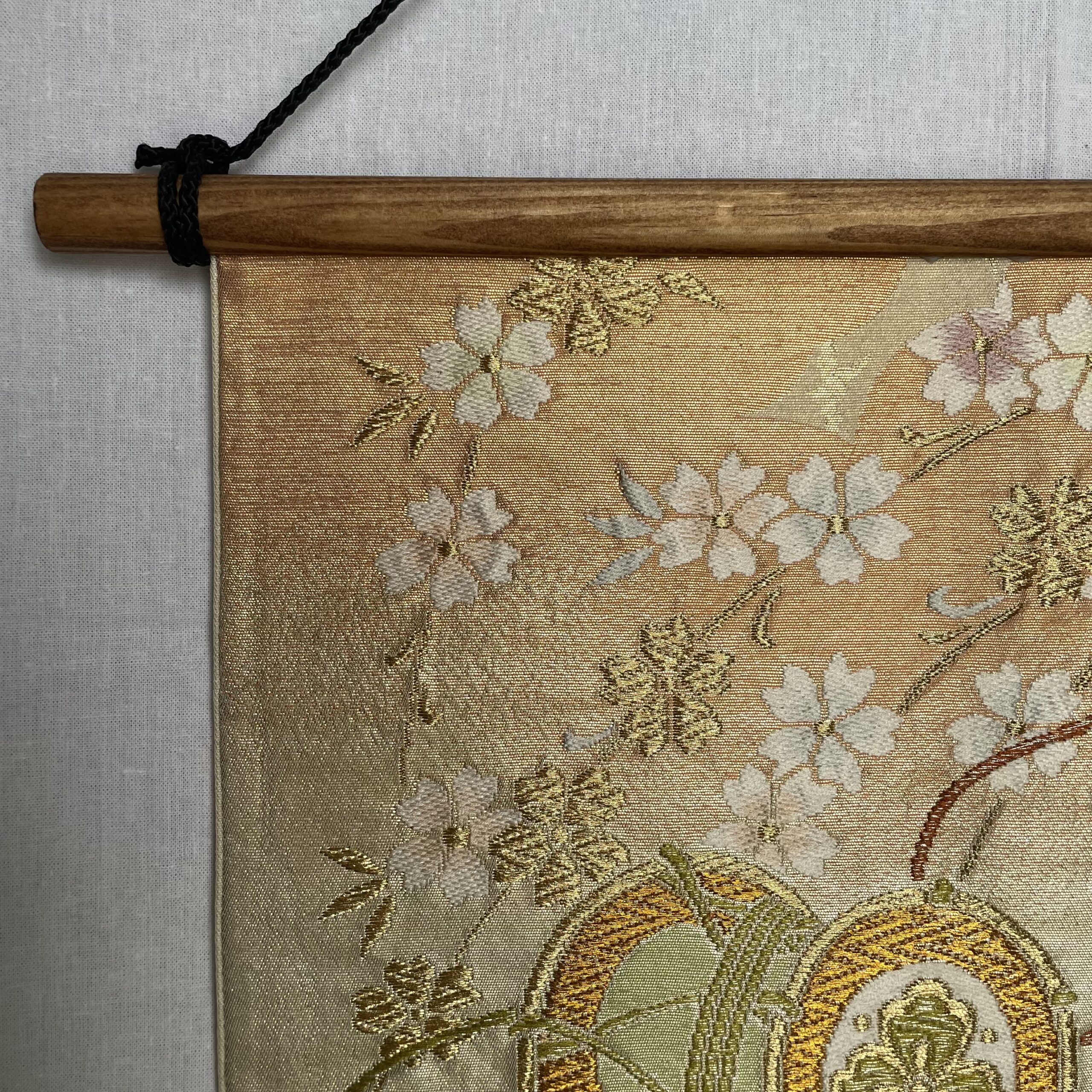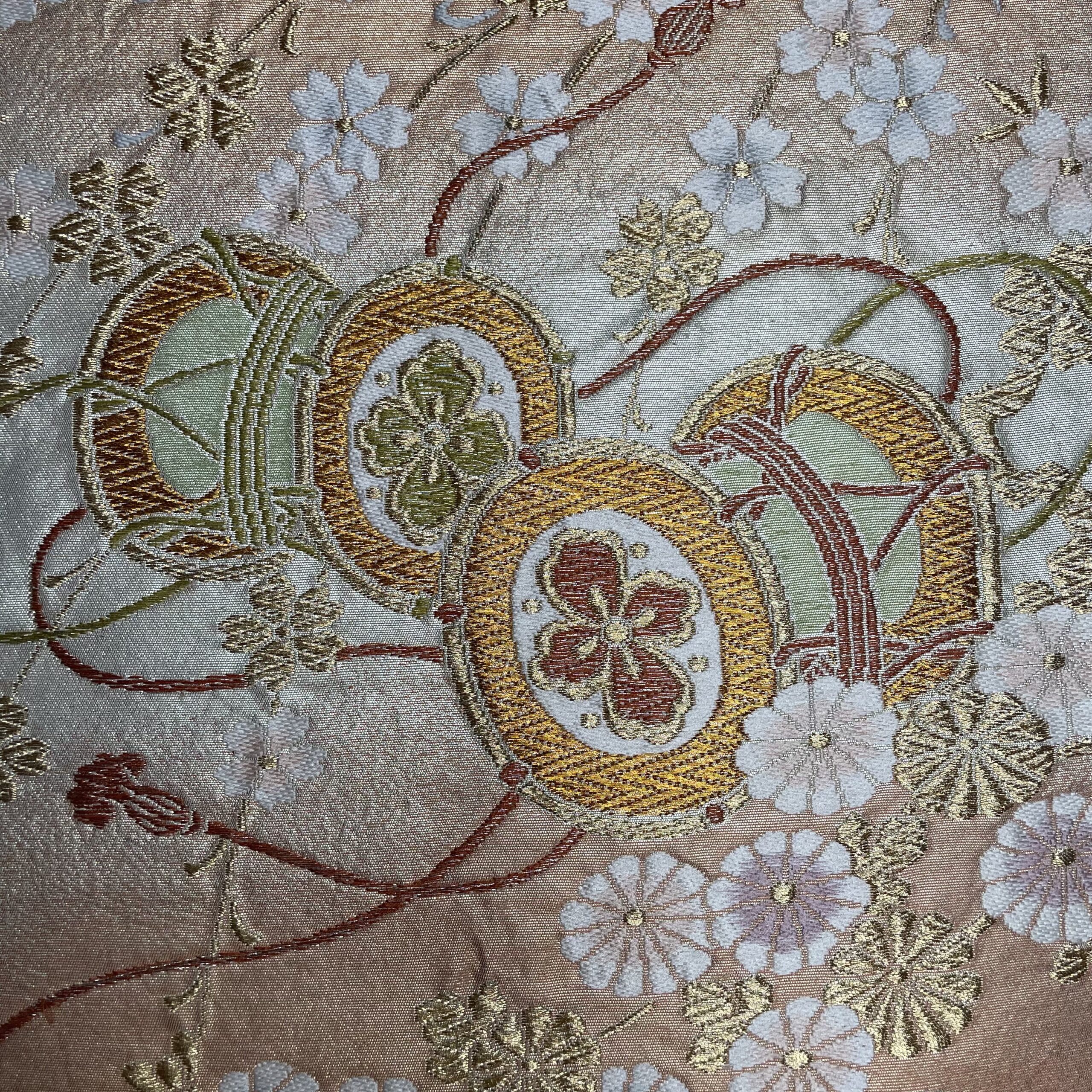 This is a one-of-a-kind item made from vintage kimono ( or obi ) fabric. Enjoy the unique variations in color and shine that change depending on the angle of light. Please handle with care, as areas with embroidery, gold thread, and silver thread may be delicate and prone to wear. Depending on the fabric, there may be slight looseness in the threads or minor stains. To preserve the fabric’s texture and color for as long as possible, avoid direct sunlight. This item is sensitive to water, so please use it indoors only.