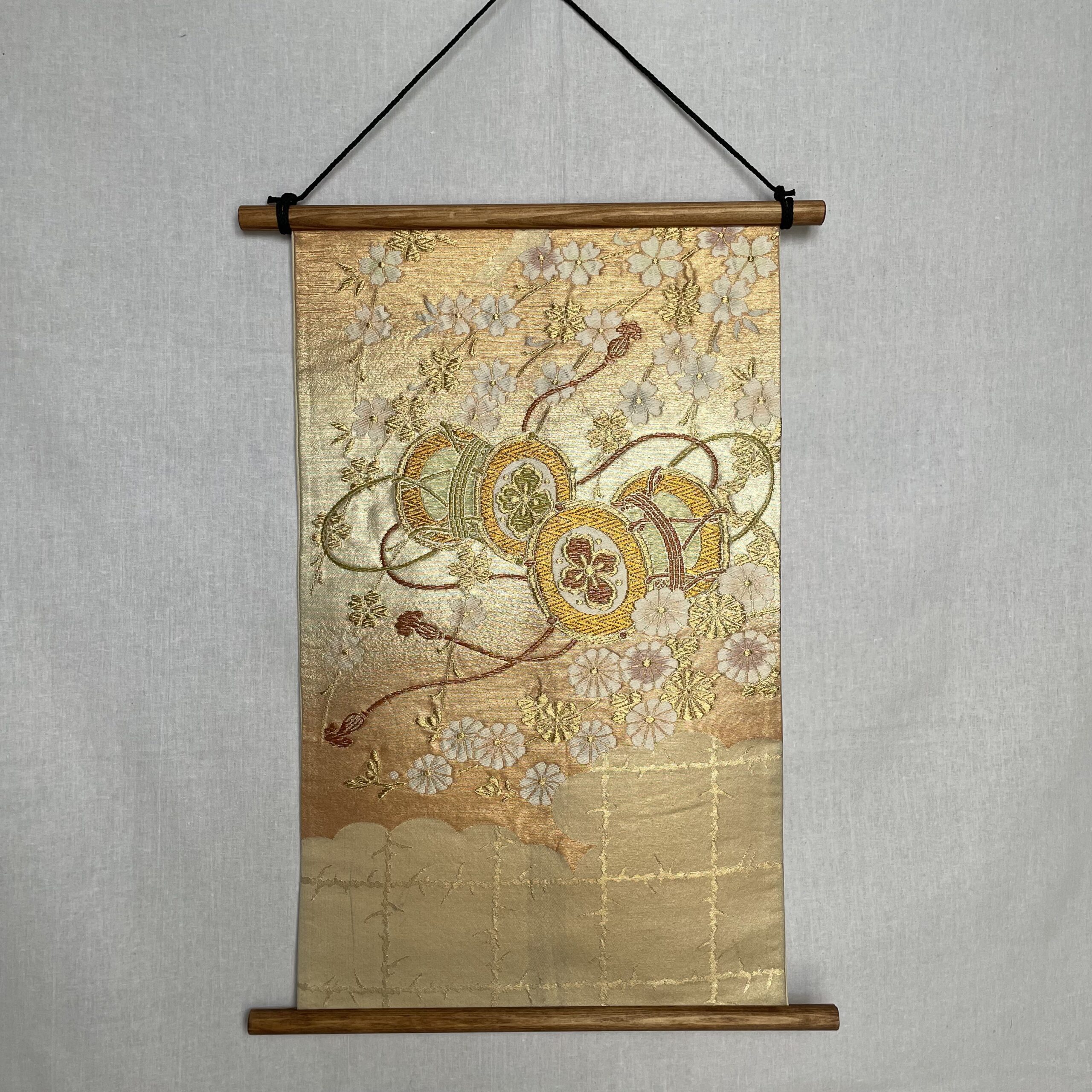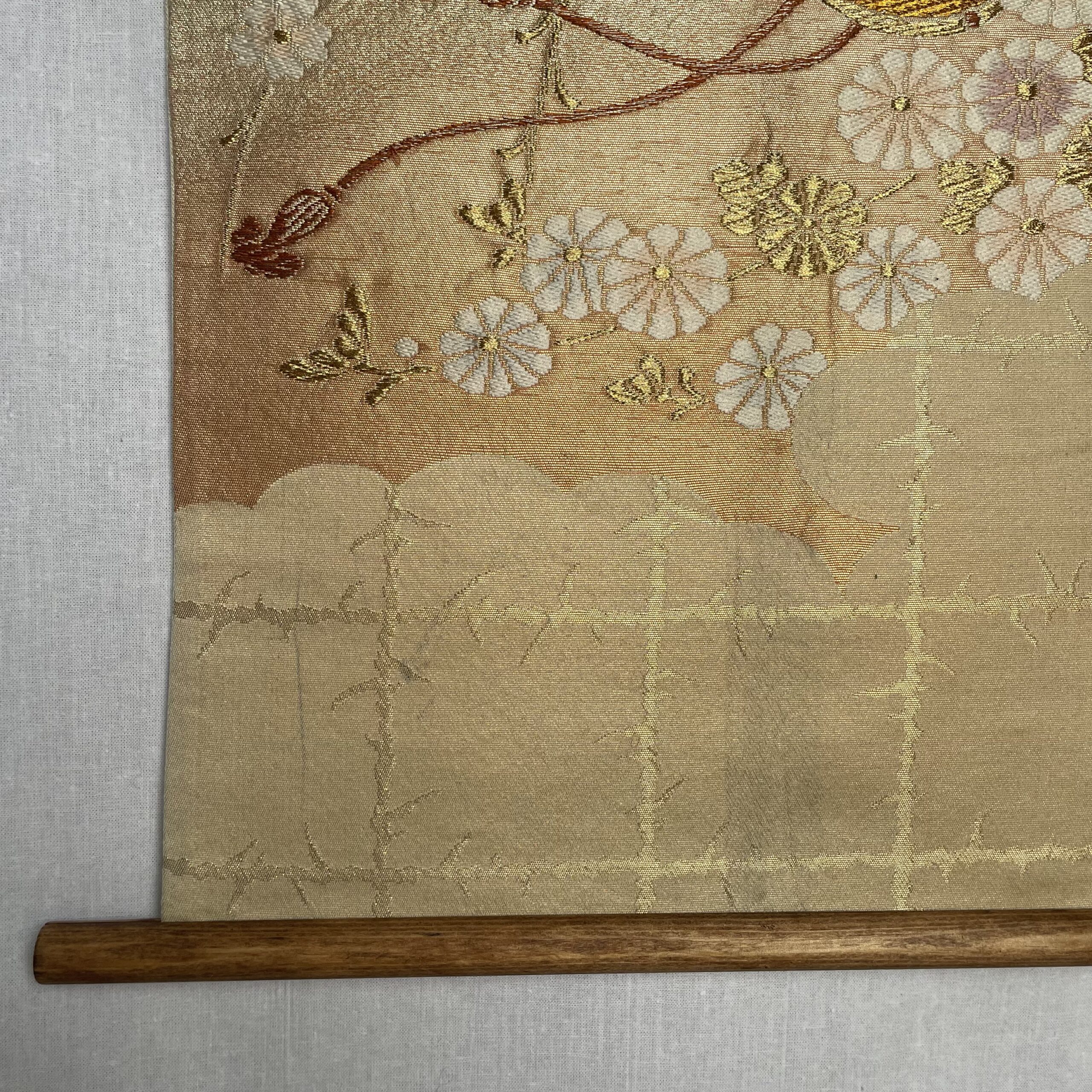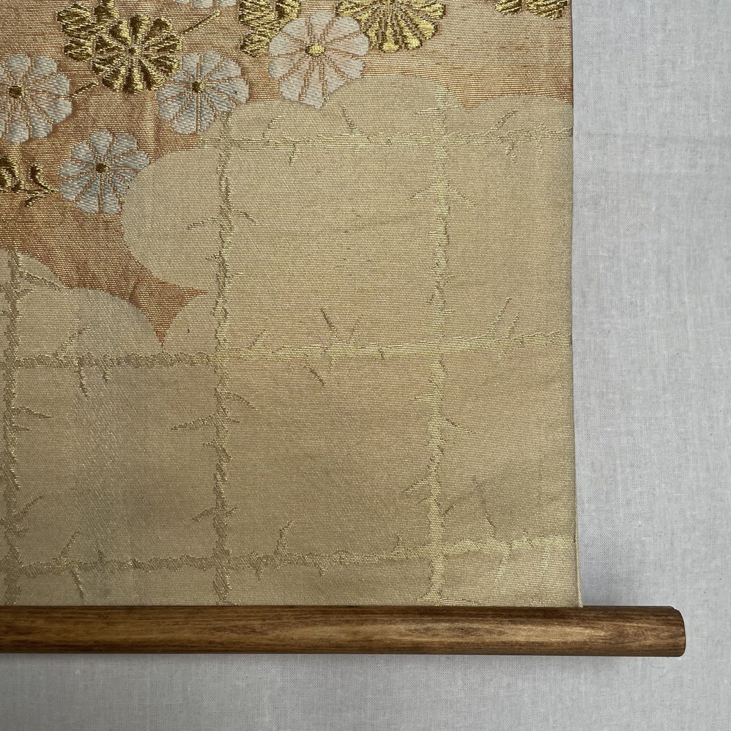 This is a one-of-a-kind item made from vintage kimono ( or obi ) fabric. Enjoy the unique variations in color and shine that change depending on the angle of light. Please handle with care, as areas with embroidery, gold thread, and silver thread may be delicate and prone to wear. Depending on the fabric, there may be slight looseness in the threads or minor stains. To preserve the fabric’s texture and color for as long as possible, avoid direct sunlight. This item is sensitive to water, so please use it indoors only.